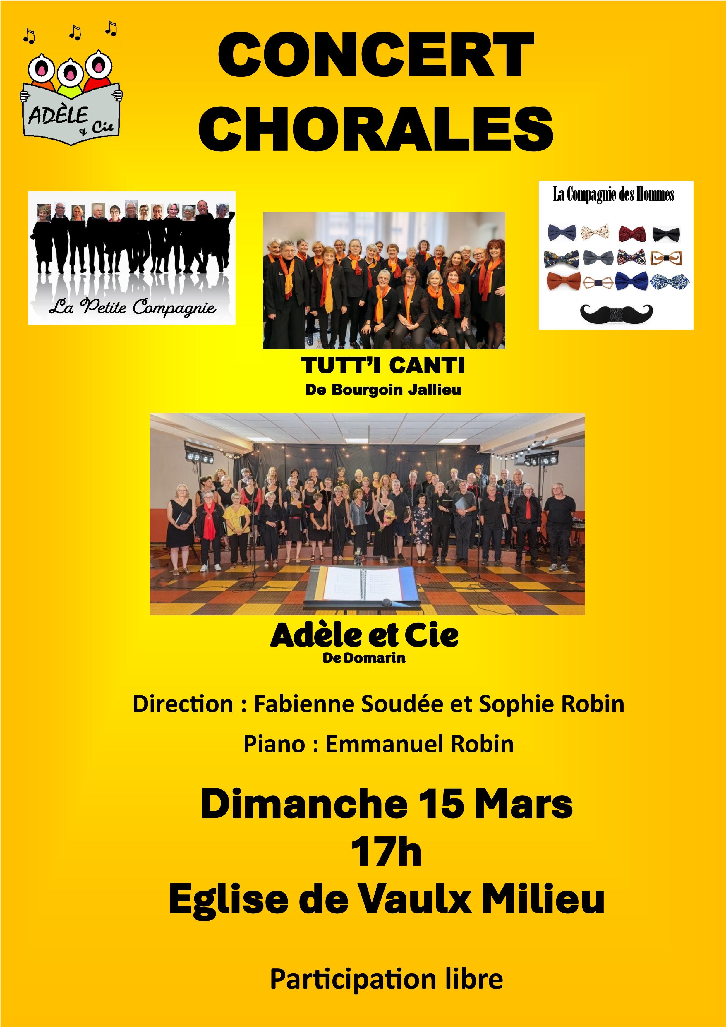 "La Petite Compagnie", chorale de poche d'Adèle; le choeur d'hommes d'Adèle "La Cie des Hommes" ; "Tutt'i Canti", choeur de femmes bien connu de Bourgoin Jallieu, et, bien sûr, la chorale de Domarin "Adèle et Cie", tous et chacun chanteront pour vous !