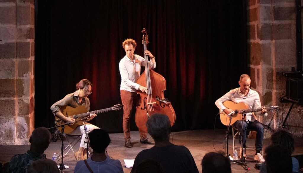 Frédéric Arnoux Trio propose une « Gypsy World Music » audacieuse et bouillonnante qui va chercher ses racines dans les musiques latines, africaines ou indiennes, tout en gardant l’instrumentation typique du « Jazz à la Django » avec deux guitares de type