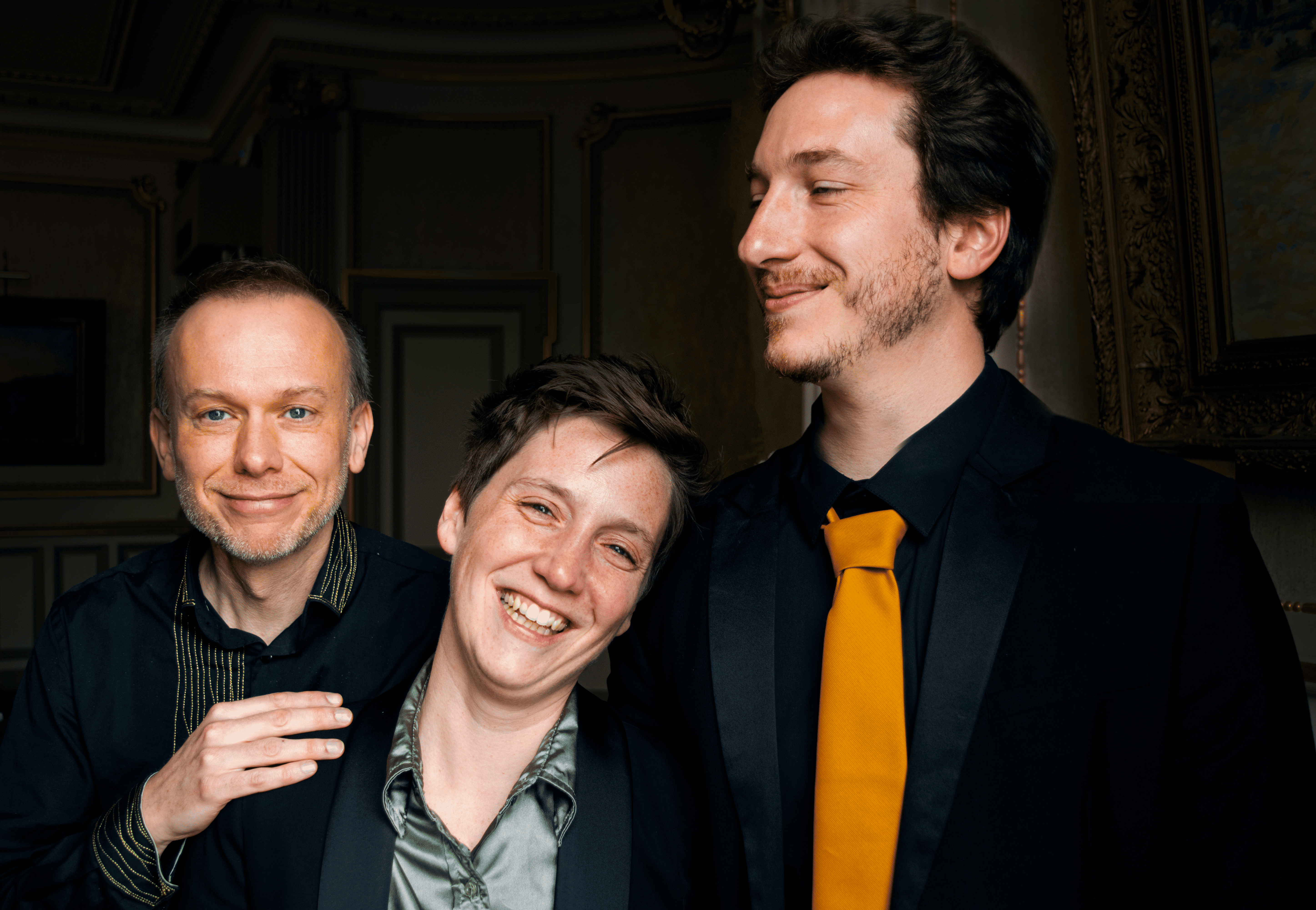 un trio instrumental réunissant guitare baroque, viole de gambe et percussions.