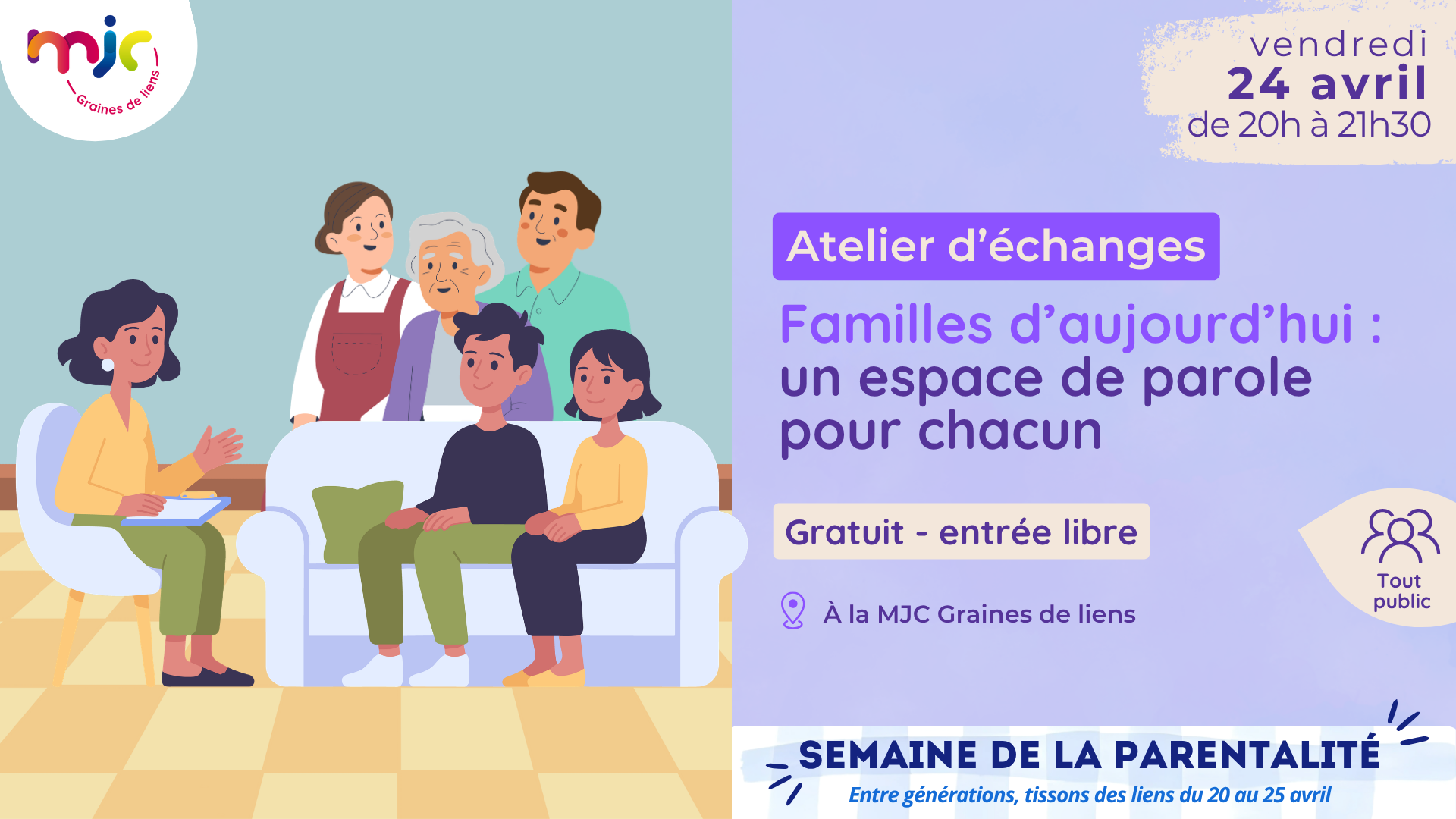 Dans le cadre de la Semaine de la parentalité, la MJC Graines de liens vous invite à une soirée d’échanges autour de la vie de famille toutes générations confondues.