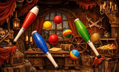 Où est donc passé le capitaine ? Sur ce bateau, livrés à eux-mêmes, quelques pirates tuent le temps en jouant avec ce qui les entoure. Des jeux parfois un peu dangereux, mais ce n’est pas grave, ce sont des pirates, pas des marins d’eau douce !