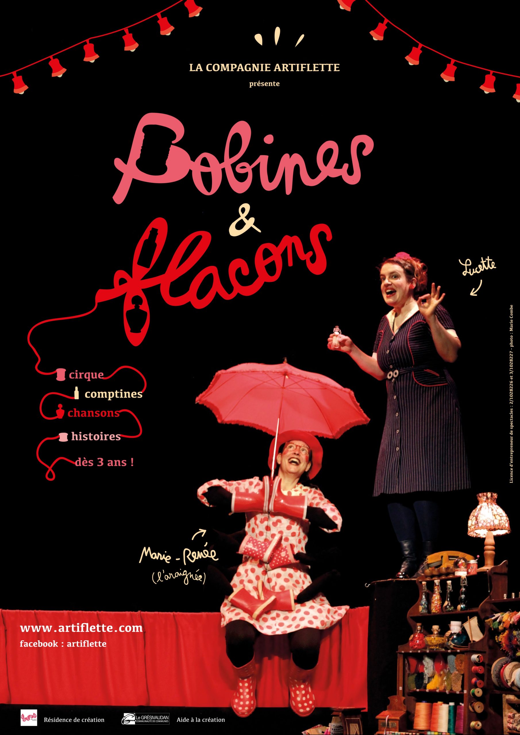 En dépit de son dégoût et de son embarras, Lucette va petit à petit accepter la présence insolite de Marie-Renée à ses côtés. Le public est invité à entrer dans l’univers magique d’une ancienne boutique. Chaque flacon, chaque petite boîte renferme une histoire, un univers particulier, une comptine connue des enfants, ou une chanson à découvrir. Bobines et Flacons mêle les styles : Personnages, Marionnettes, Conte, Théâtre d’objet, Ombres chinoises, Cirque… au rythme d’un répertoire musical varié : Comptines, Chants du monde, Chanson française…
