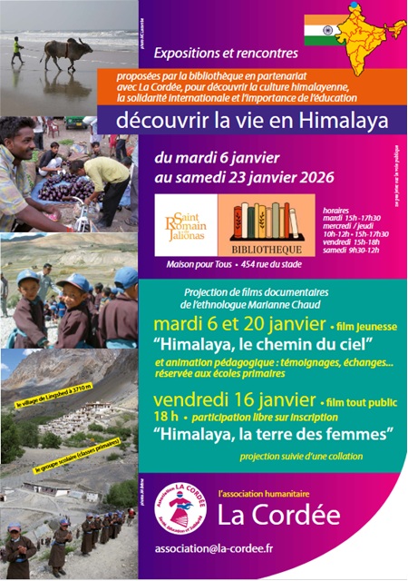 L'association humanitaire La Cordée organise en partenariat avec la bibliothèque de St-Romain-de-Jalionas cette projection d'un documentaire réalisé par l'ethnologue Marianne Chaud pour découvrir la vie en Himalaya. Projection suivie d'une collation.