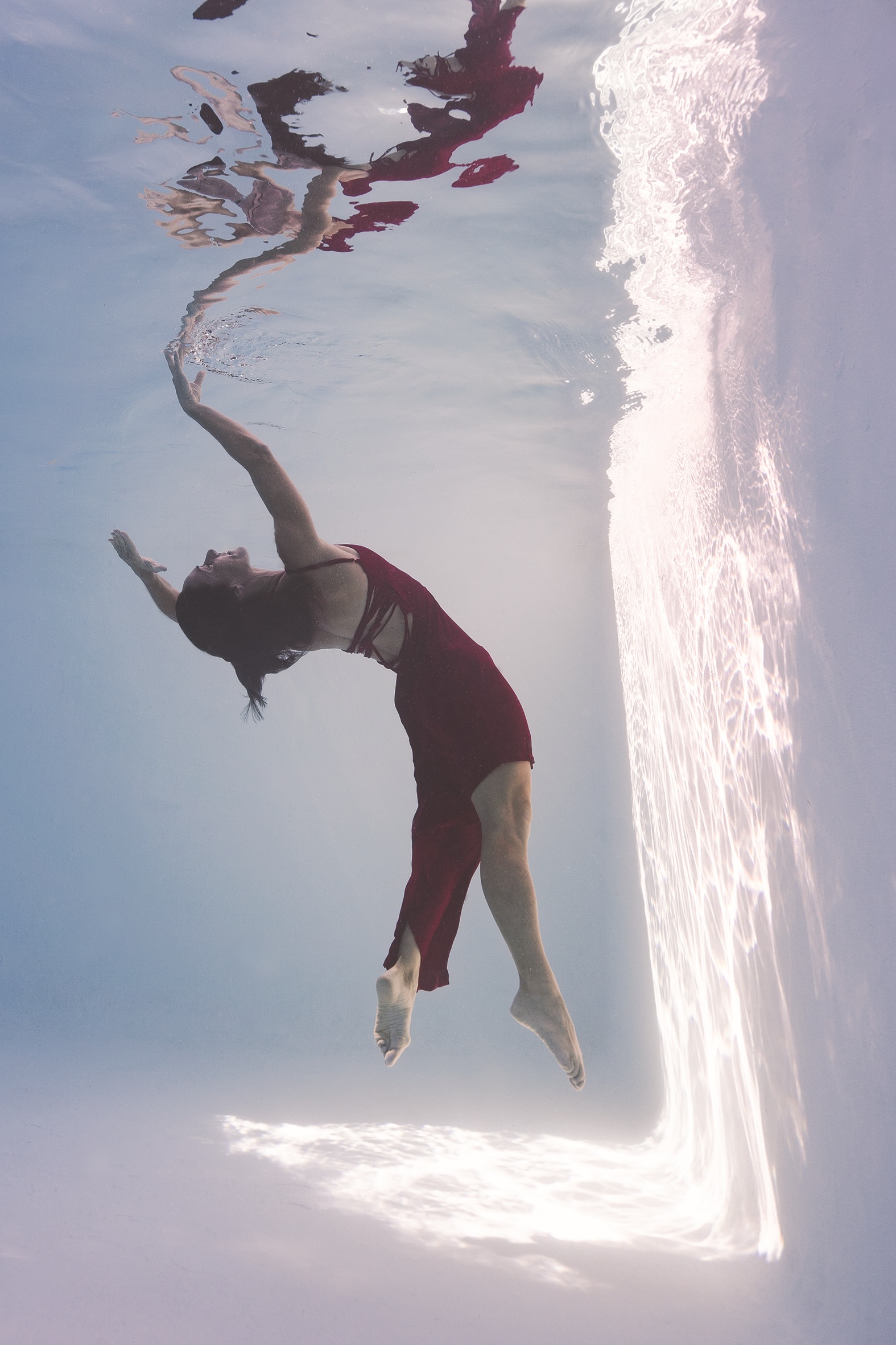 Mais au-delà du geste sportif, Réflexions aquatiques explore les jeux de reflets, l’apesanteur et la lumière dans l’eau.