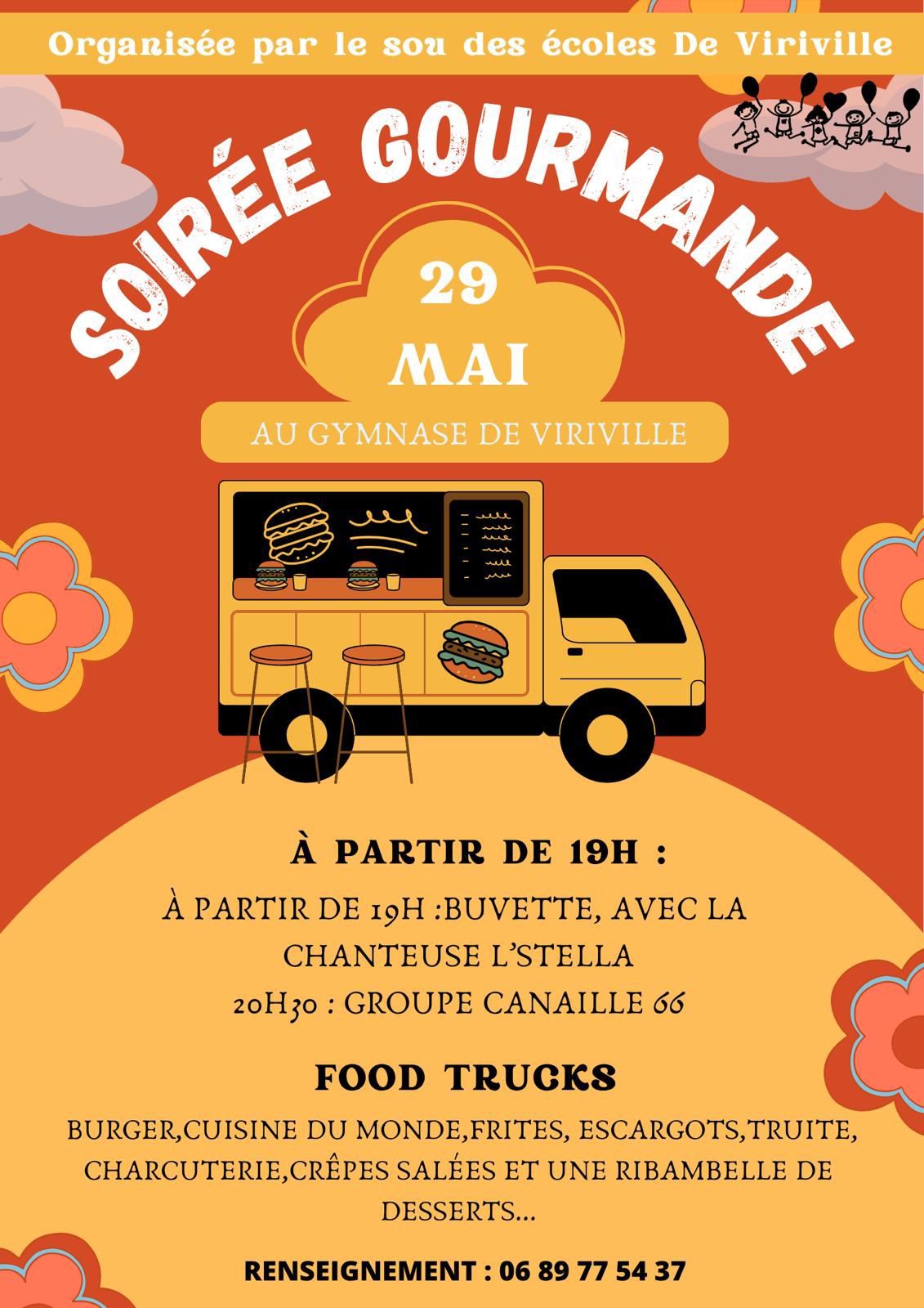 Soirée gourmande et musicale organisée par le sou des écoles de Viriville avec buvette, la chanteuse L'Stella et le groupe Canaille 66, ainsi que des food trucks proposant divers plats et desserts.