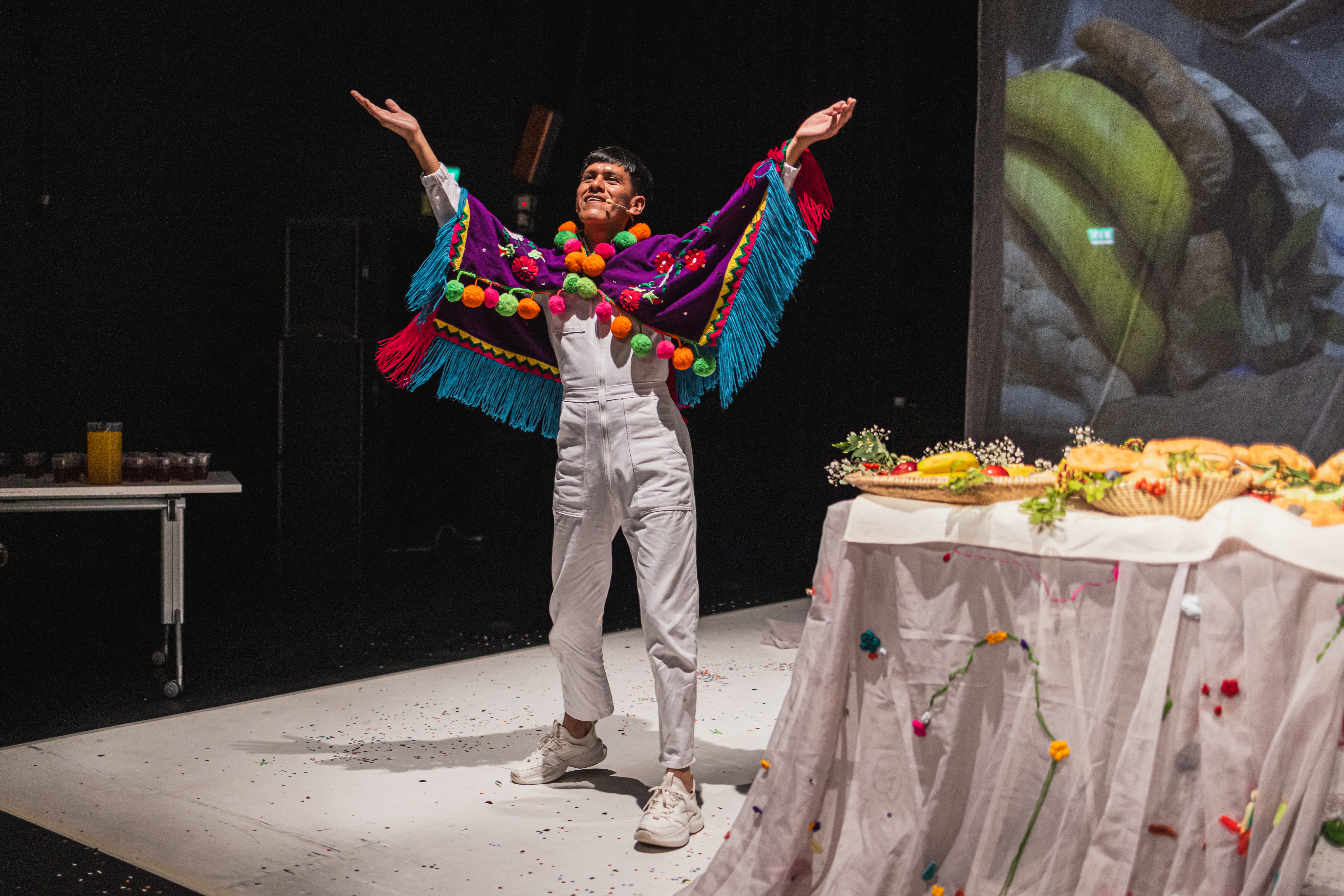 Originaire de la province de Jujuy, à l’extrême nord de l’Argentine, Tiziano Cruz nous entraîne dans un voyage qui commence par le tintement d’une cloche. S’ensuivent des récits et des images de montagne. Plus tard, des rituels autochtones qu’il restitue sur scène. Puis viennent des gestes issus de rituels autochtones, qu’il restitue sur scène avec une grande simplicité. Des gestes simples, précis, qui apparaissent comme un contre-modèle à la violence du monde.